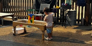 The fenced-in play area is spacious, with circular track, large sandbox, plenty of trikes, scooters, push-carts, and space just to hang out.